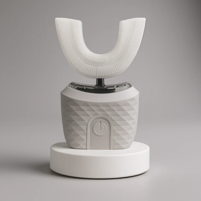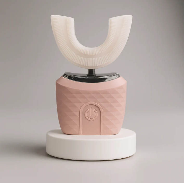 Brush360, U biçimli yumuşak silikon başlığı ve sonik titreşimleriyle dişleri aynı anda sarar. 45–60 saniyelik kısa bir rutinle pratik ve tutarlı temizlik sunar